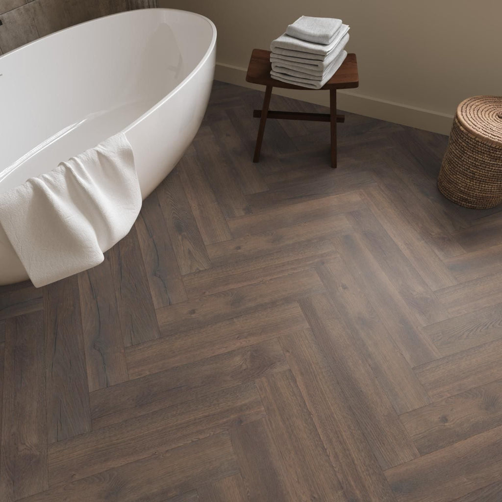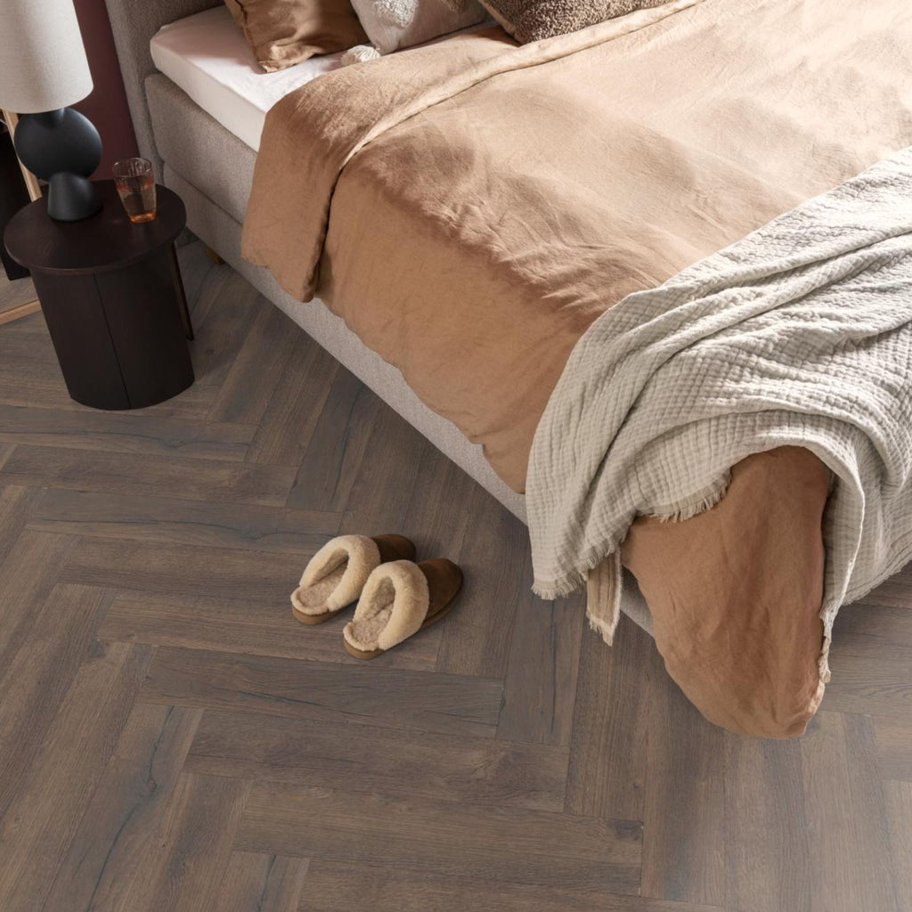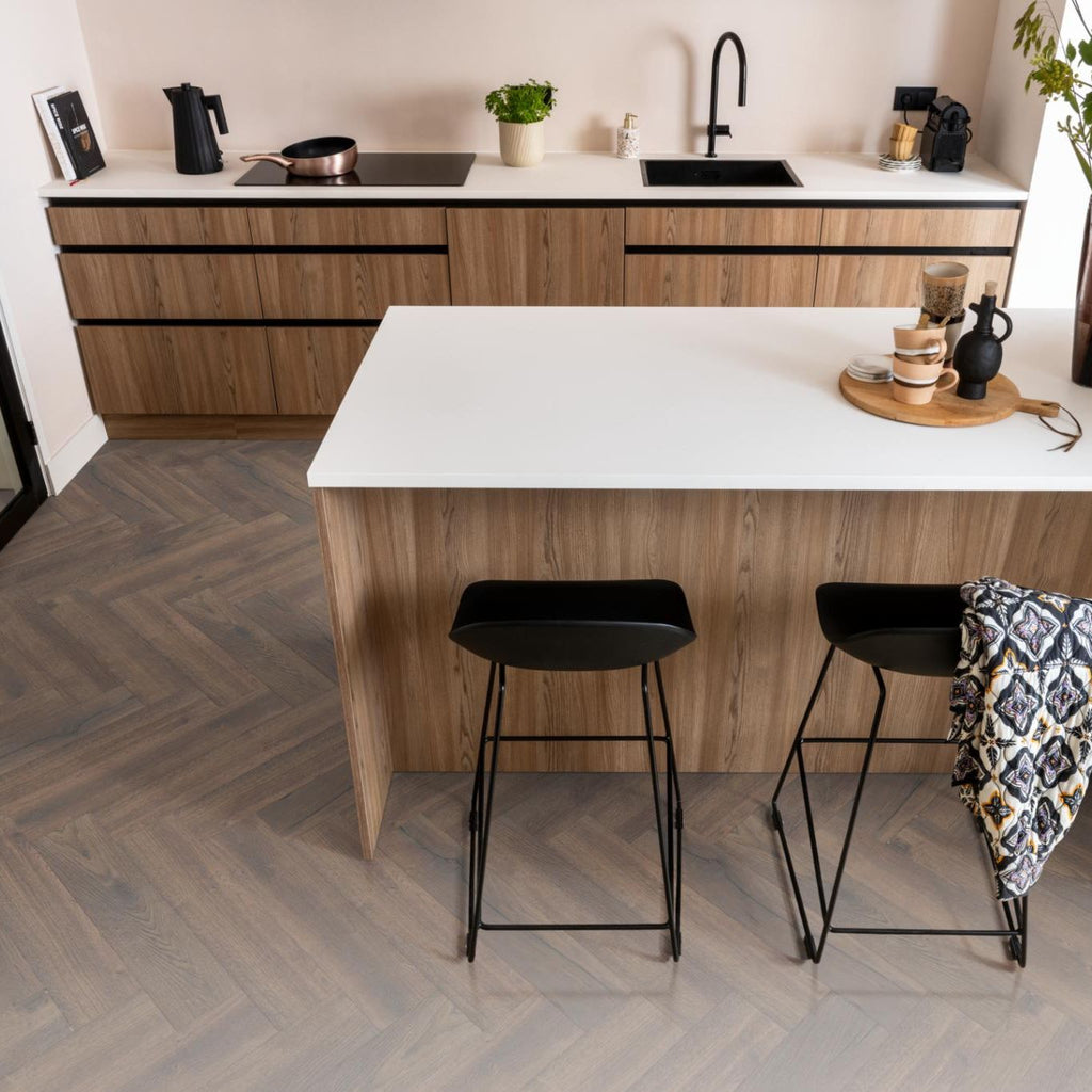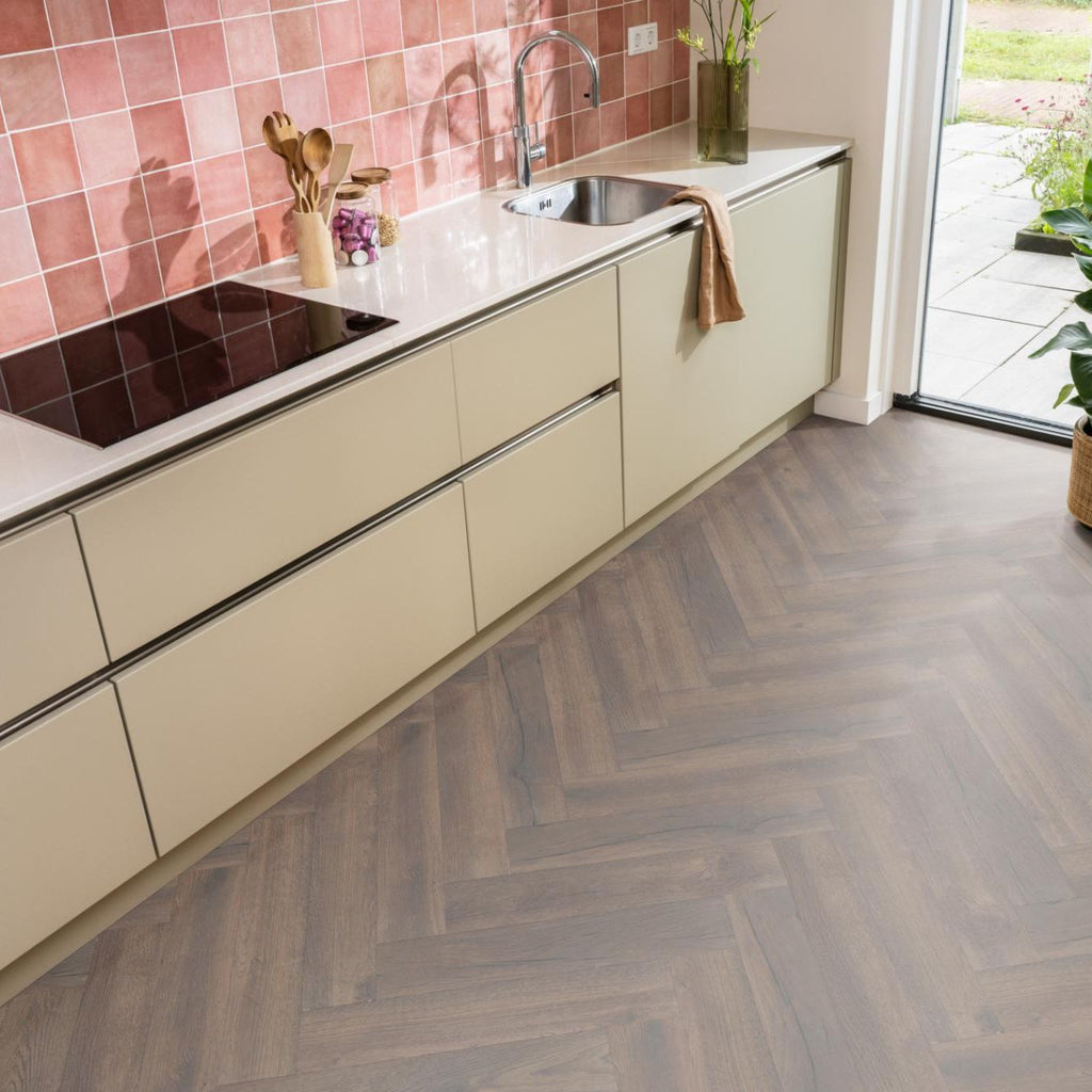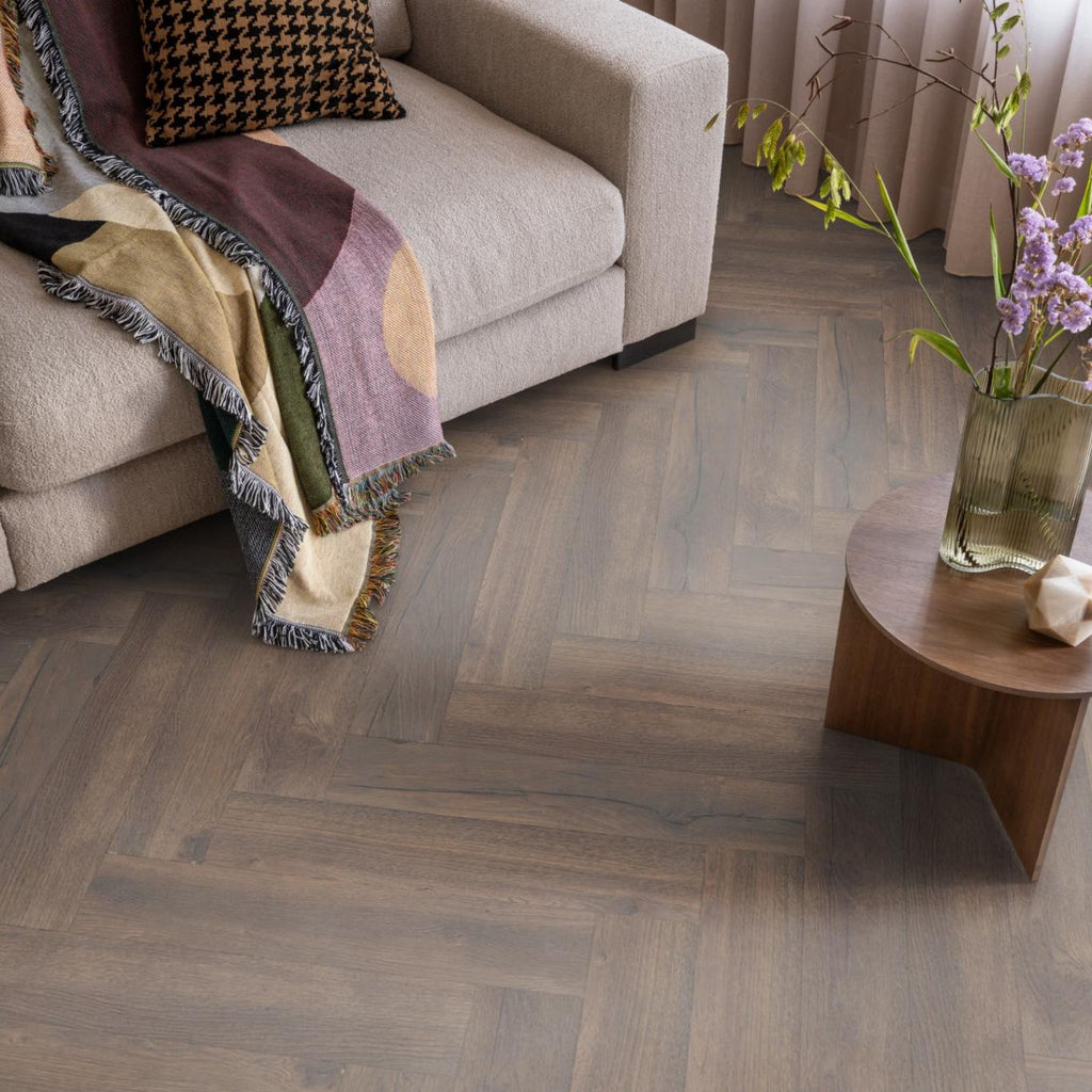 De trend van het moment: laminaat in het moderne en strakke visgraatmotief. De authentieke en realistische look maken de vloer een genot om naar te kijken in iedere ruimte. Niet alleen het uiterlijk, maar ook de eigenschappen maken deze vloer tot een van onze favorieten. Zo is deze uiterst geschikt voor zwaar woongebruik, gemakkelijk in onderhoud en toepasbaar in iedere ruimte.