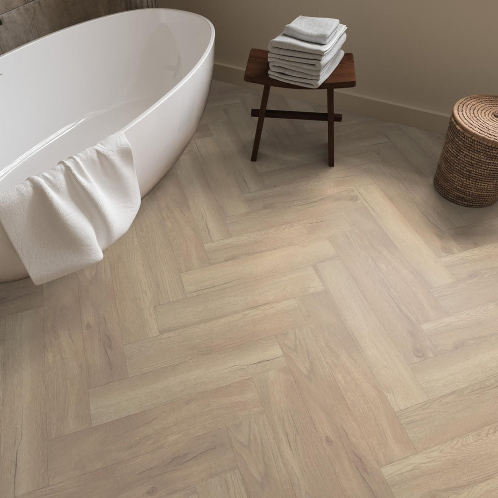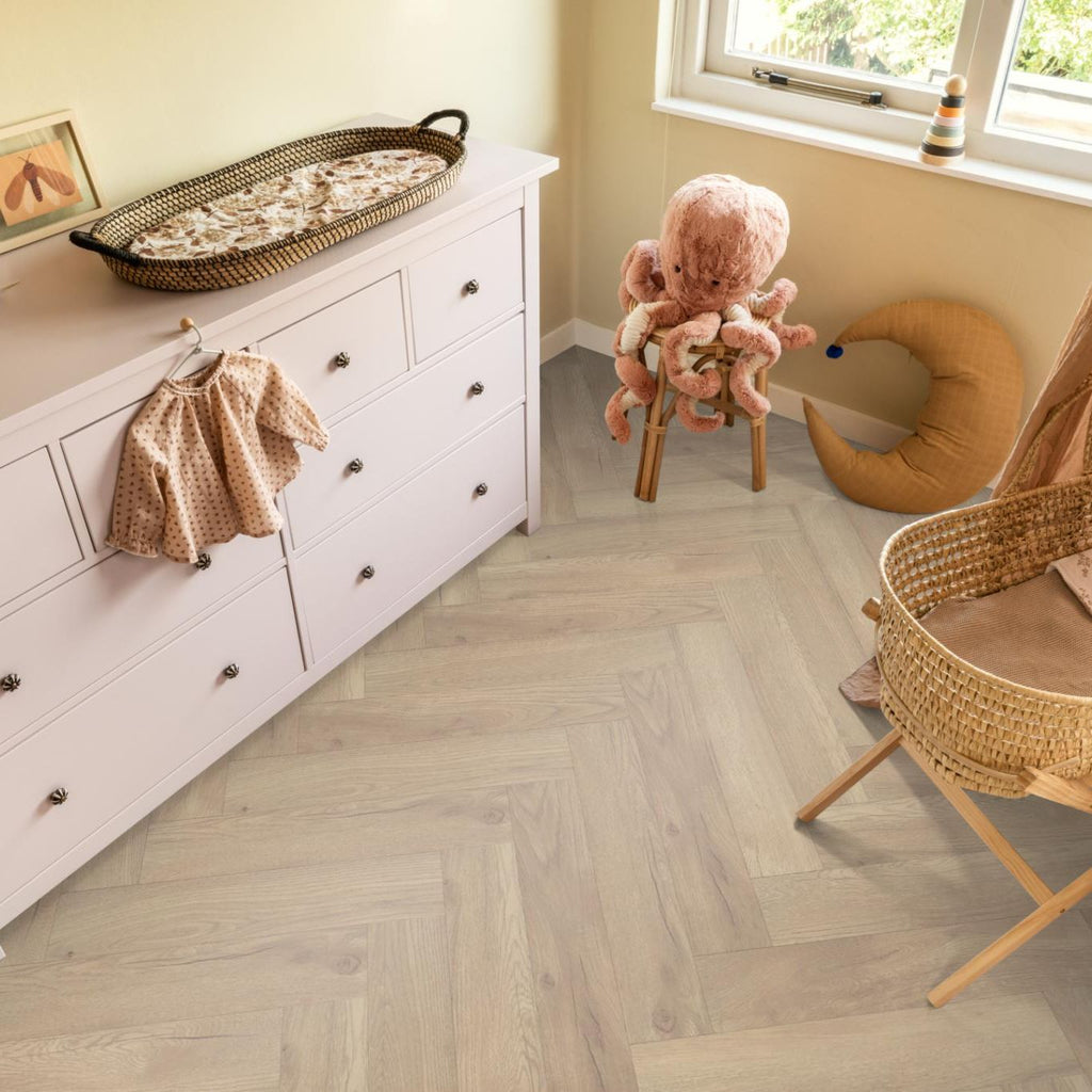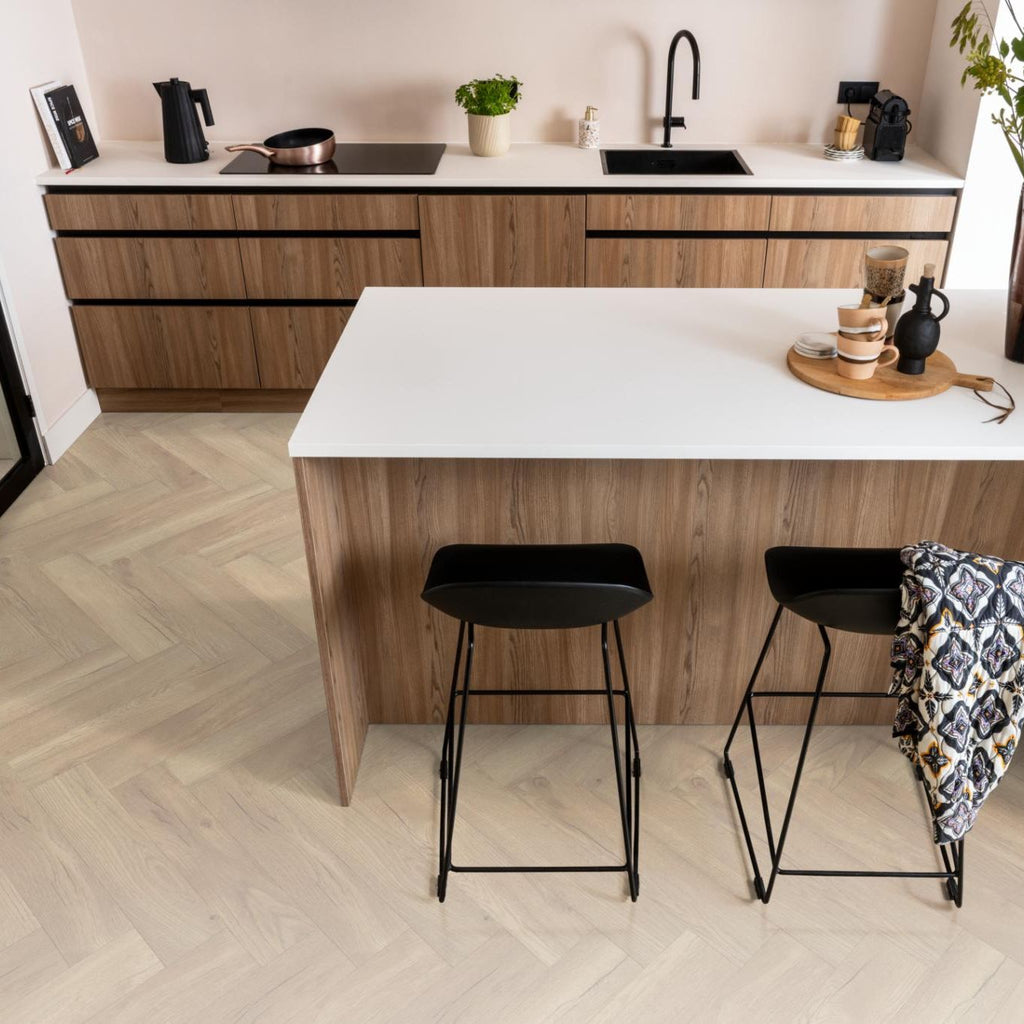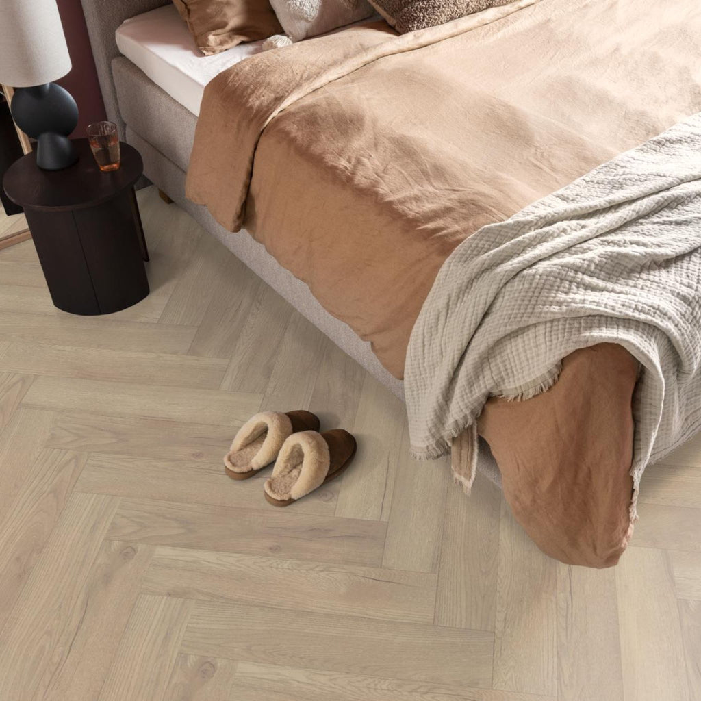 De trend van het moment: laminaat in het moderne en strakke visgraatmotief. De authentieke en realistische look maken de vloer een genot om naar te kijken in iedere ruimte. Niet alleen het uiterlijk, maar ook de eigenschappen maken deze vloer tot een van onze favorieten. Zo is deze uiterst geschikt voor zwaar woongebruik, gemakkelijk in onderhoud en toepasbaar in iedere ruimte.