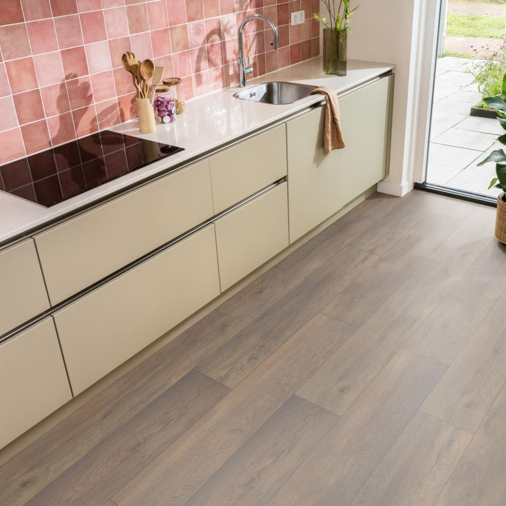 De Saarland is de ideale vloer voor vochtige ruimtes zoals badkamers en bijkeukens. Met zijn waterbestendige planken biedt hij zowel stijl als functionaliteit. De natuurgetrouwe structuur en matte afwerking zorgen voor een strakke uitstraling en eenvoudig onderhoud. Bovendien is deze vloer geschikt voor vloerverwarming en -koeling. Verkrijgbaar in zes kleuren, van wit tot donker eiken, zodat hij in elke ruimte past.