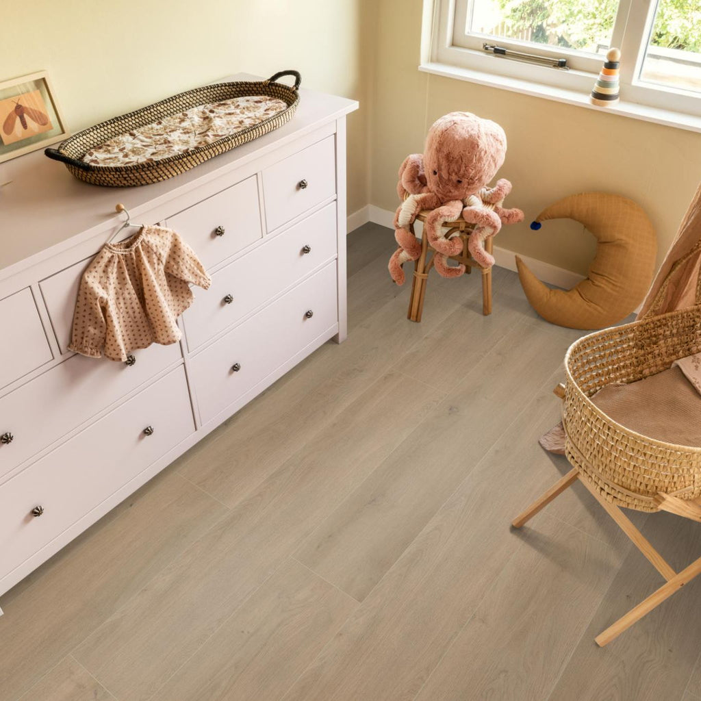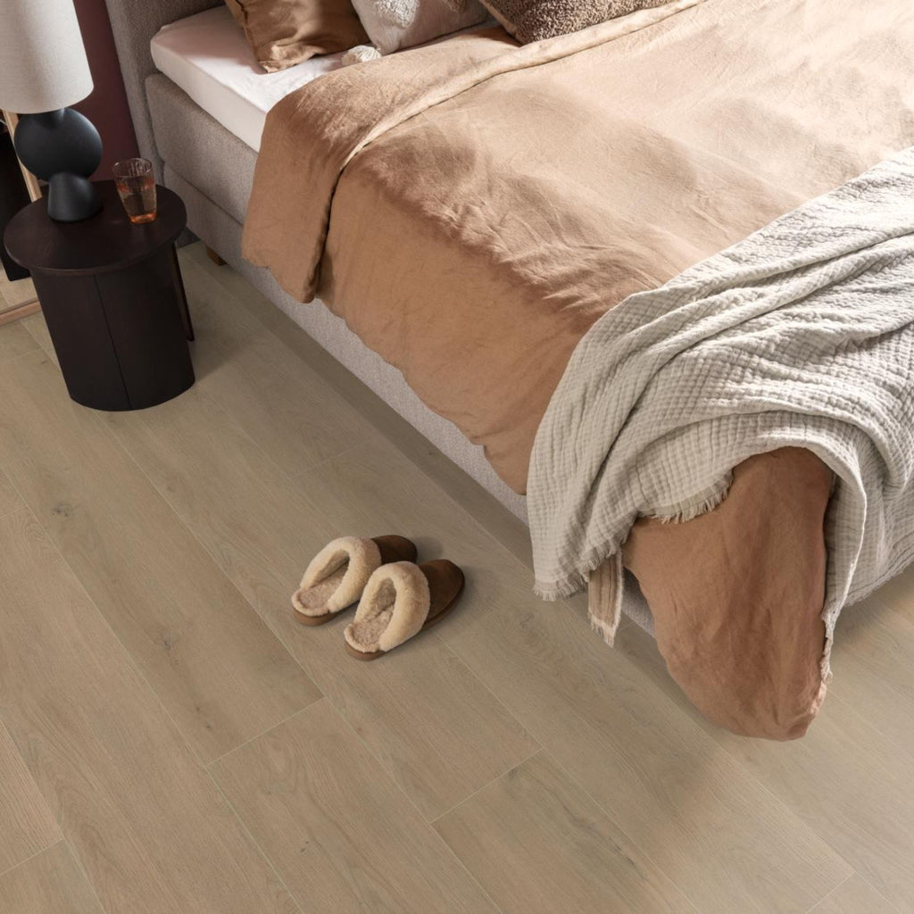 De Sereno, verkrijgbaar in vier moderne kleuren, geeft je interieur een robuuste uitstraling met zijn extra brede planken. Brede laminaatplanken zorgen voor een rustig en egaal effect, waardoor je ruimte direct groter oogt. De allover structuur en matte toplaag maken de vloer veelzijdig, passend bij elke interieurstijl. Bovendien is Sereno geschikt voor zowel vloerverwarming als -koeling, zodat je het hele jaar door geniet van ultiem comfort.